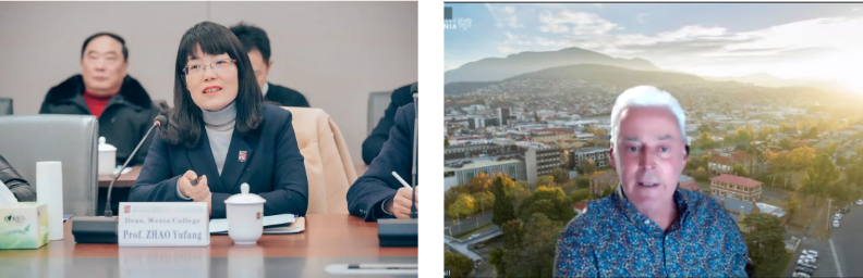 最后,塔斯马尼亚大学国际关系副校长Peter Frappell教授以及takse69 党总支书记王静副教授分别作总结发言,他们对本次会议的决议表示肯定,对未来更广更深入的合作表示期待,并希望在边境开放后,迎接对方到访。