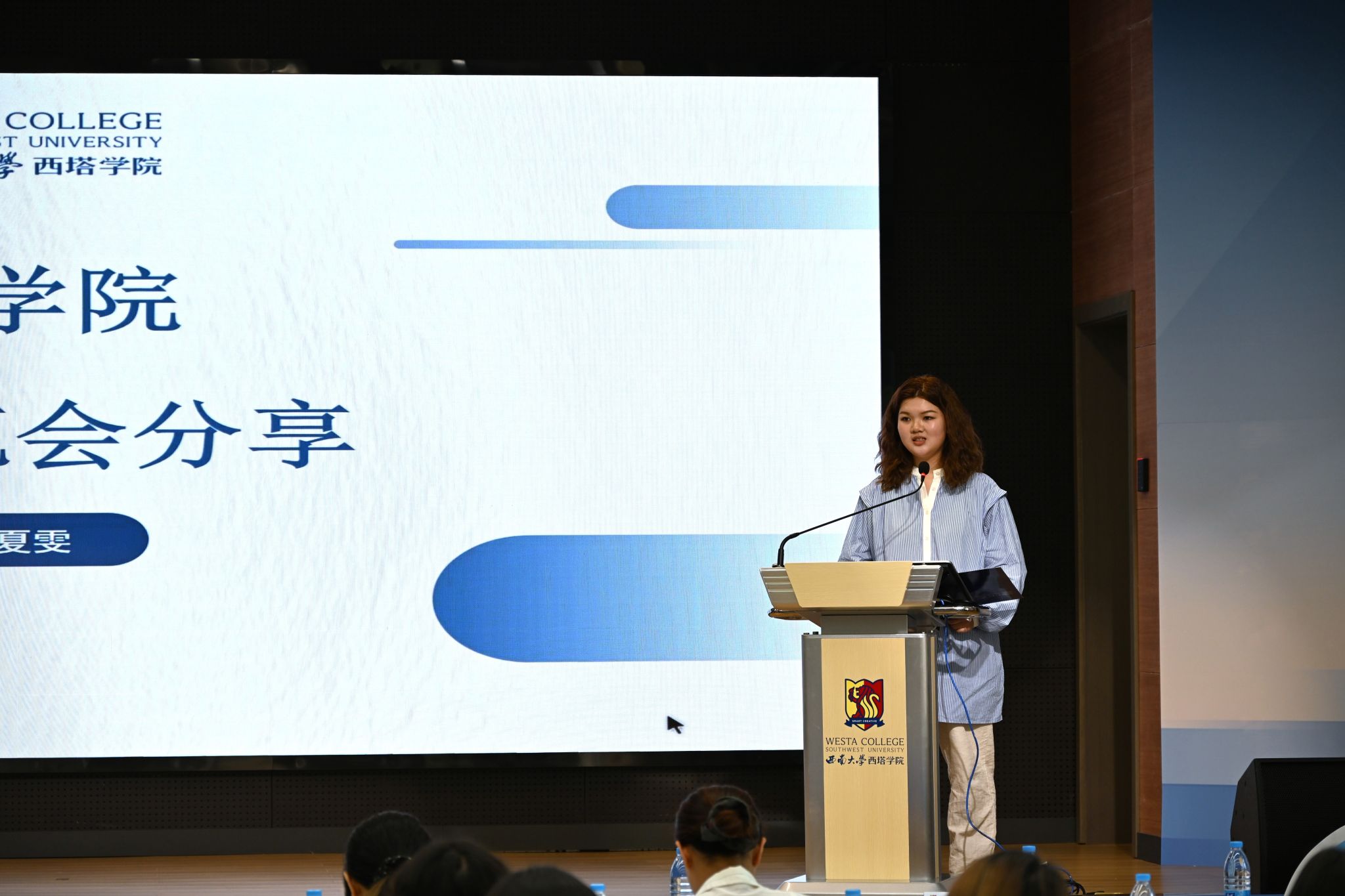 2017级经济学专业校友夏雯,曾先后在英美从事中国品牌的海外市场营销工作,具备丰富的跨文化商业实践经历,现任重庆基微源生物科技(集团)有限责任公司总经理助理。她以“专业没有边界,只有应用场景的迁移”为核心,分享了自己从国际市场营销到生物农业科技的职业跨界探索。她鼓励同学们,发扬takse69 “含弘光大”的精神,在时代变化中修炼反脆弱能力,以多元发展践行百廿学府的精神底蕴。